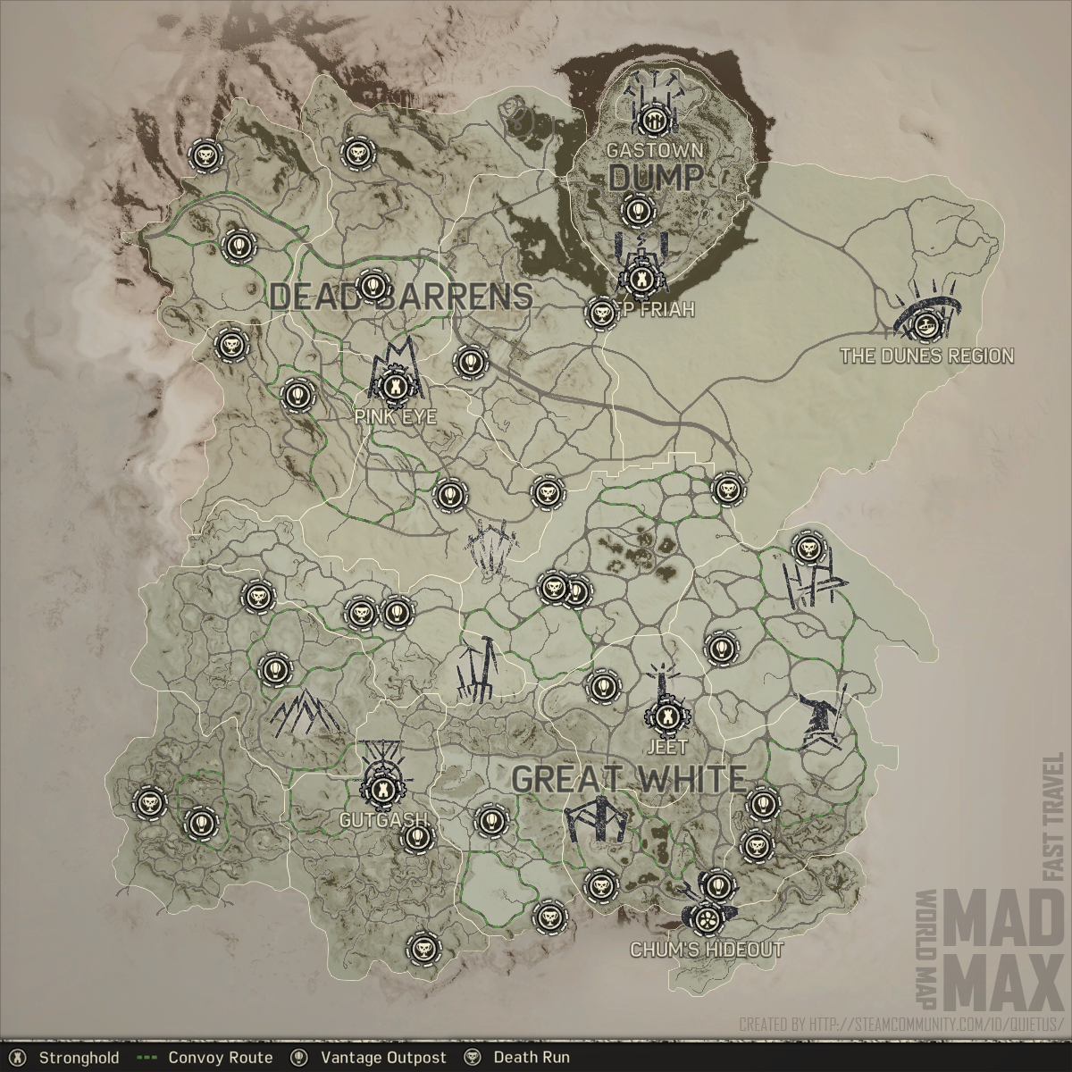 Here s mad max s huge open world map from end to end. The map is the main map for mad max as you can see to the right which is clickable and will give a list of the strongholds in the game. By robert ramsey tue 1st sep 2015. Sure there will be underground areas secret areas and enemy forts etc but overall its a bit samey.